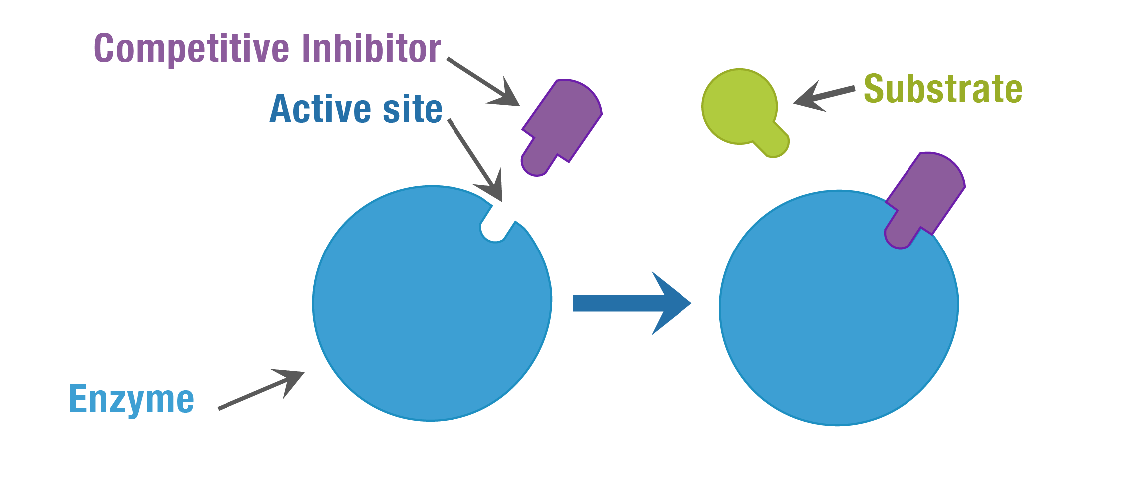 There are 2 types of inhibitors that can influence the function of the enzyme: competitive and non-competitive inhibitors [1]. Competitive inhibitors are when the substrate “looks like” the molecule, the inhibitors bind to the enzyme blocking of the substrate. Noncompetitive inhibitors are when the inhibitor enters the enzyme without blocking the substrate and changing the shape of the enzyme so that the substrate can no longer interact with it [7].